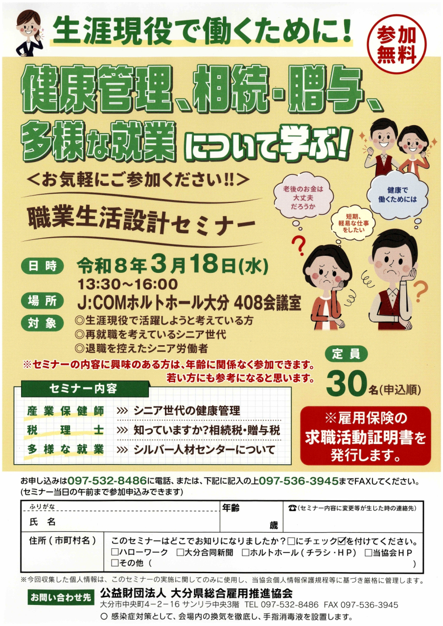 (公益財団法人)大分県総合雇用推進協会は、大分県の雇用の確保と安定に資することを目的として 若年者・高年齢者及び障害者等の安定した雇用の確保、適正な労働条件の確保を図る為、企業説明会・就職面接会・各種セミナーや講習会の開催、おおいたde就職するねっとの運営などの事業を行っています。